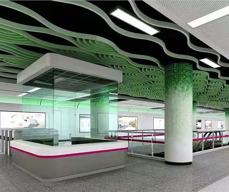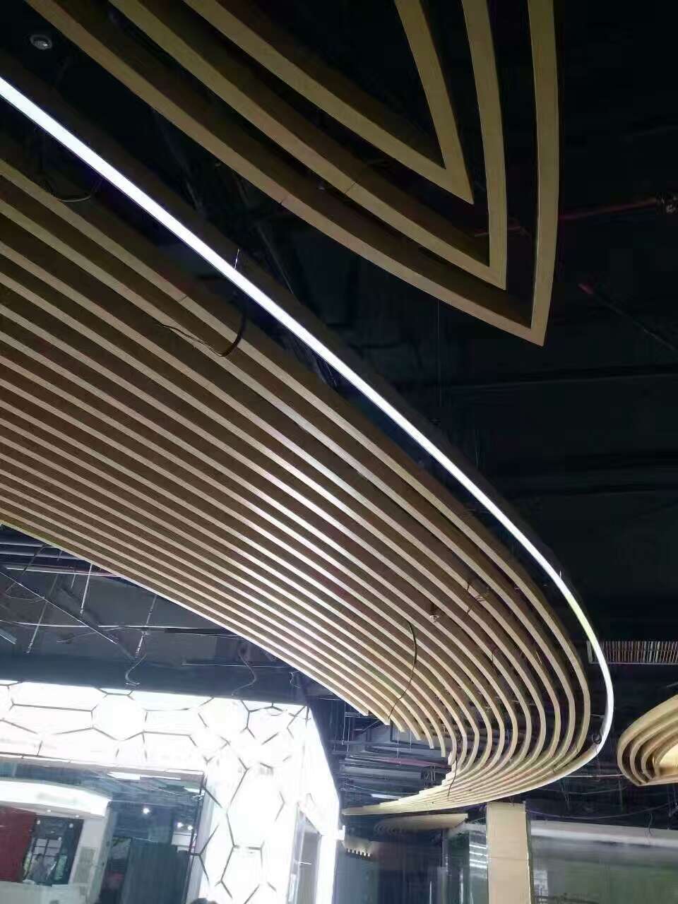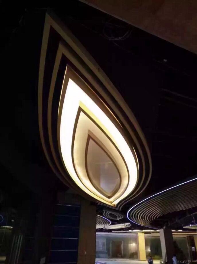 弧形的鋁方通打破常規(guī)的直線形鋁方通,顯得別具一格,優(yōu)美而流暢的線條使裝飾的空間美不勝收,為建筑增添了柔和之感。開透式空間與燈飾等相映襯使空間更溫馨和諧。